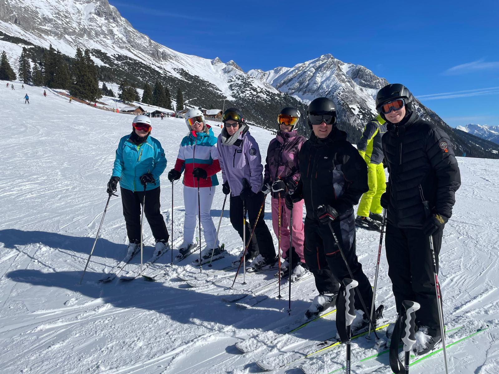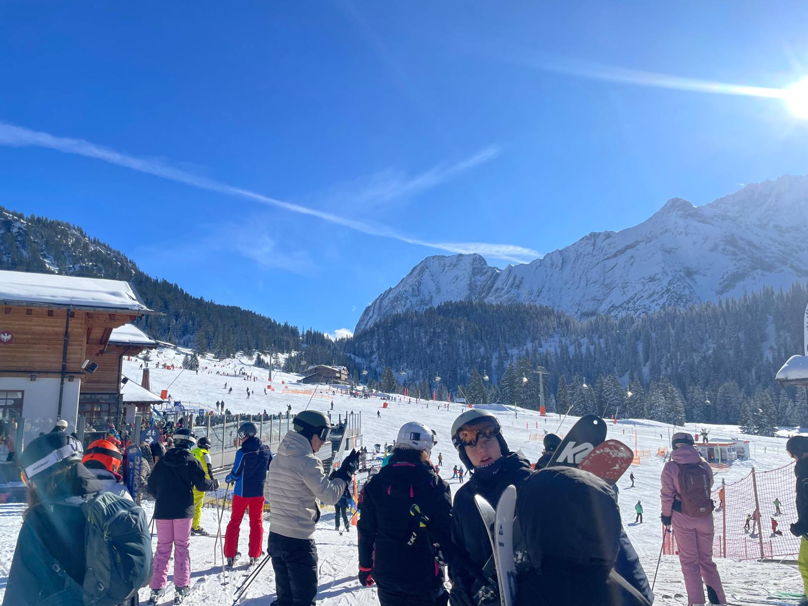 Der erste Skitag rückte näher und am Morgen fuhr die Gruppe in Richtung Zugspitze, ins Skigebiet von Ehrwald. Kaiserwetter mit strahlendem Sonnenschein vor dem Zugspitzmassiv und besten Schnee- und Pistenverhältnissen aufgrund der kalten Temperaturen erwartete die Skifahrer. Sie wurden in verschiedenen Gruppen entsprechend ihres skifahrtechnischen Levels eingeteilt und professionell durch die vom Deutschen Skiverband ausgebildeten Übungsleiter unterrichtet. In kleinen Gruppen wurden alle Teilnehmer auf ihrem Leistungsniveau abgeholt und konnten individuell betreut werden. So fühlt sich jeder sicher und spürt die eigenen Fortschritte am besten.